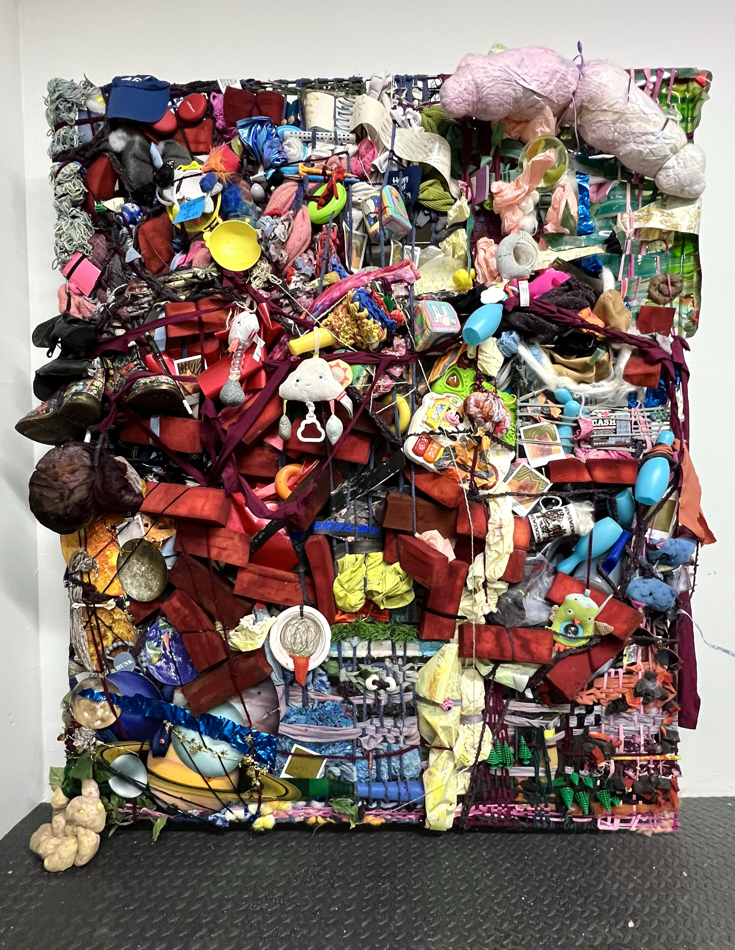 found objects, household objects, made objects, yarn cut from clothing, metal armature